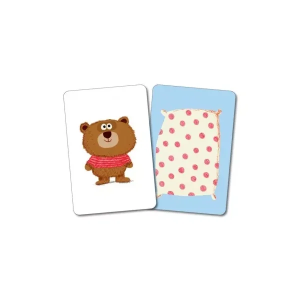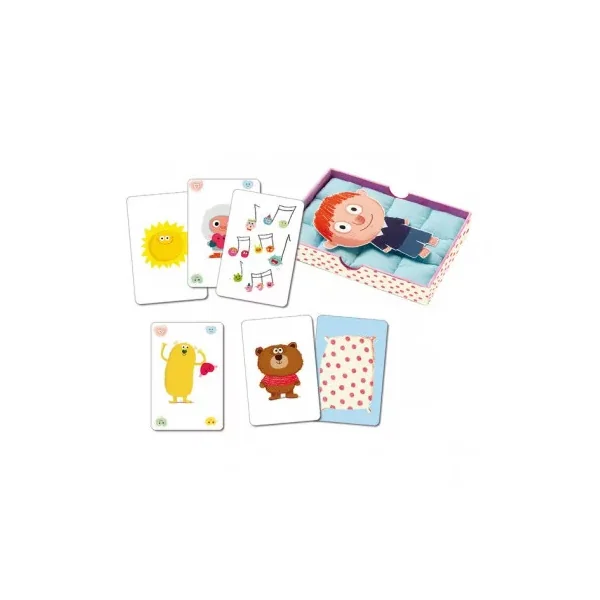 Avant d’aller dormir, on place le personnage de son choix (garçon ou fille) au fond de la boîte qui devient un lit avec son petit matelas. Pour réussir à s’endormir, il faut retrouver l’oreiller, la couverture et le doudou parmi les cartes. La partie s’arrête lorsque ces 3 cartes sont réunies. Les cartes « action » qui ont été retournées pendant la partie sont ensuite à réaliser : câlins, chatouilles, bisous, petites chansons…