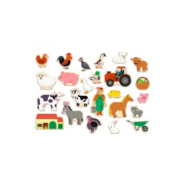 Un coffret de 24 pièces magnétiques en bois à placer sur un tableau magnétique ou sur un frigo, l’occasion d’échanger avec votre enfant sur le nom des animaux qu’il va découvrir. Une grange, un tracteur, une brouette, ainsi que de nombreux animaux, tels qu’une vache, un mouton, un cochon, une poule, un lapin… des animaux de la ferme pour amuser les enfants et pour inventer des histoires.