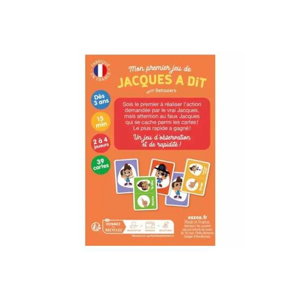 Découvrez le jeu Mon premier jeu de Jacques a dit de Auzou, un jeu de cartes de rapidité et d’observationpour jouer de 2 à 4 joueurs à partir de 3 ans. Le célèbre jeu de cour de récré enfin adapté en jeux de cartes!