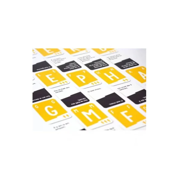 Le but du jeu est de se débarrasser de toutes ces cartes « Lettre » en répondant plus vite que les autres à des thèmes hilarants! Des centaines de thèmes drôles et décalés (ex : C’est mou, Ça finit en « ette », Un loisir de grand-père, On le dit quand on marche dans une crotte, …).