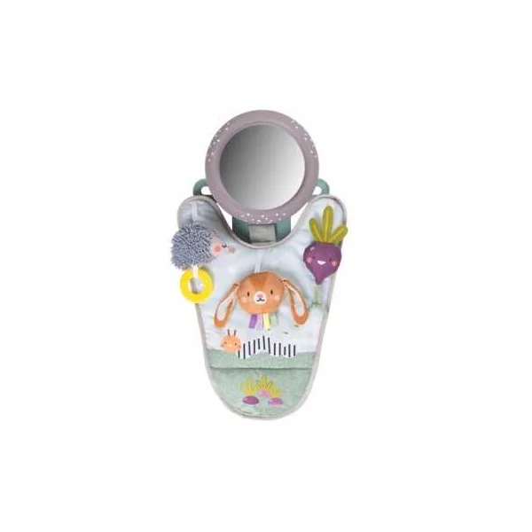 Le kit se compose d’un tableau d’activité et d’un miroir incurvé. Le miroir permet aux parents assis à l’avant de la voiture d’avoir un œil sur bébé. Ce jouet d’éveil comprend des activités variées: betterave bruissante, hérisson texturé avec anneau de dentition et lapin carillon.