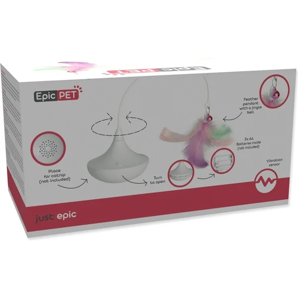 Base tournante pour chats avec un attrayant pendentif en plumes qui, par son matériau et son mouvement, soutient leurs instincts de chasse naturels. Le pendentif sur le jouet tourne et flotte à différents intervalles. Cela augmente l’intérêt des chats pour le jeu. Il est possible d’insérer de la catnip (herbe à chat) dans la partie perforée inférieure pour accroître l’attrait du jouet.