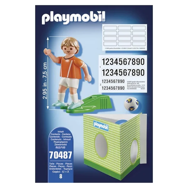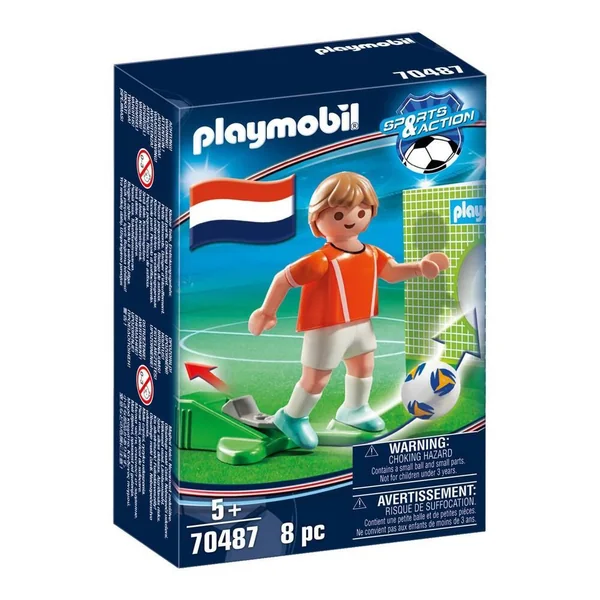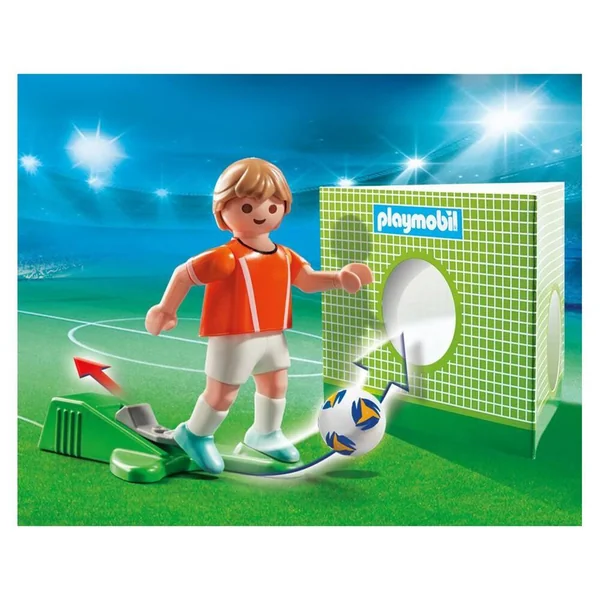 Joueur de football avec fonction de tir à une main, un ballon, une cage pour s’entraîner à marquer des buts et des numéros pour le maillot. Maillot avec l’emblème de l’équipe du Pays-Bas. Le joueur permet de compléter l’équipe du Grand terrain de football transportable.