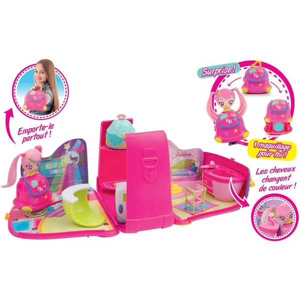 1 vanity qui s’ouvre et révèle un espace beauté et 1 espace disco ! 1 mini sac qui se transforme en mini poupée avec du gel pailleté pour le corps pour toi inclus dans un compartiment secret. Nombreux accessoires et fonctions de jeu (plateforme de danse, cheveux magiques,..). 1 livret collection incluse. Taille de la poupée : 9,5 cm environ.