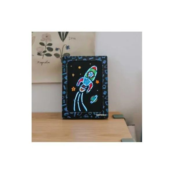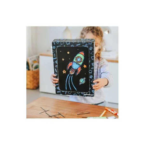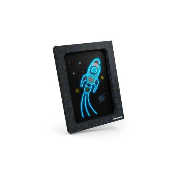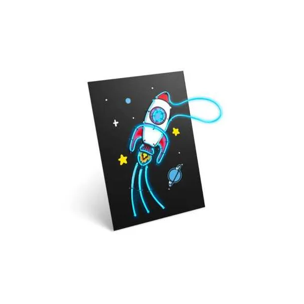 Lorsque le tableau lumineux est terminé, l’enfant construit son cadre en utilisant la boîte du kit, conçue pour se transformer facilement en support décoratif. Il suffit d’y placer la création pour obtenir un véritable tableau néon, prêt à être exposé dans une chambre d’enfant ou un espace de jeu.