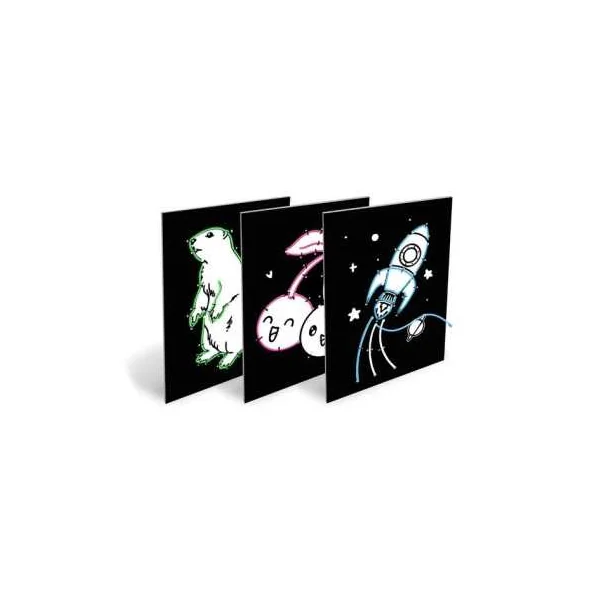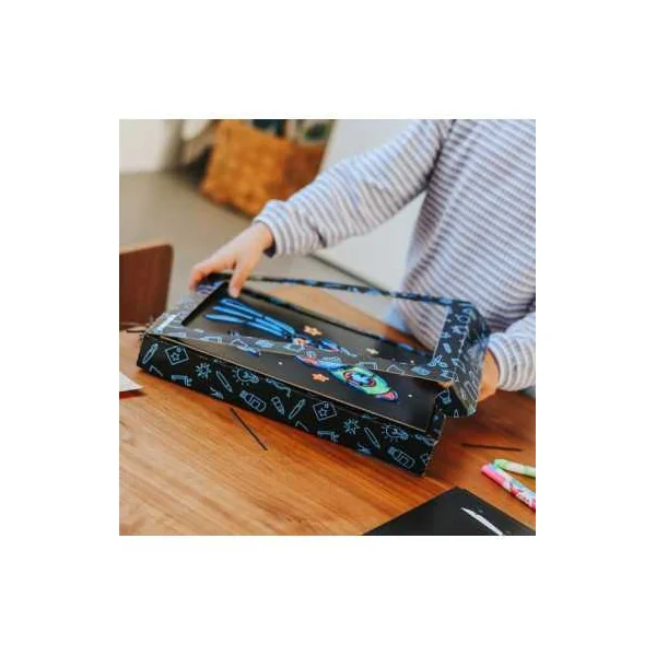 Le coffret comprend 9 planches pré-perforées, 3 néons (rose, bleu, vert), 6 marqueurs et une batterie rechargeable.