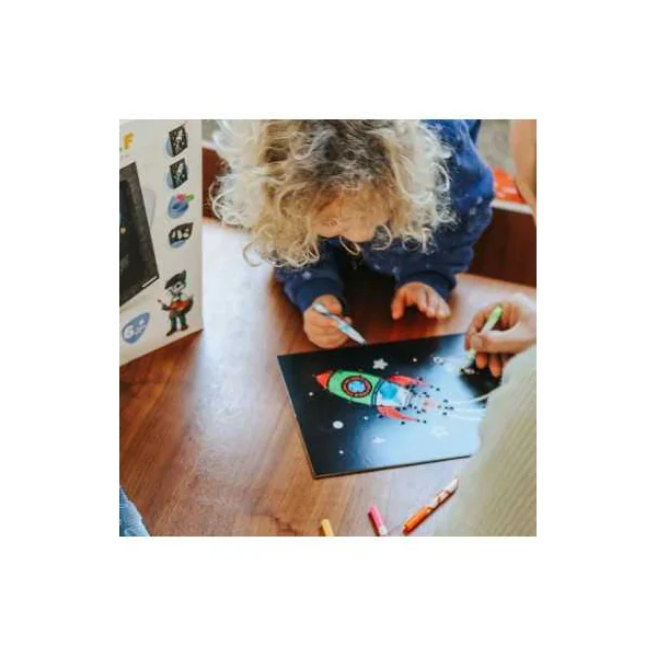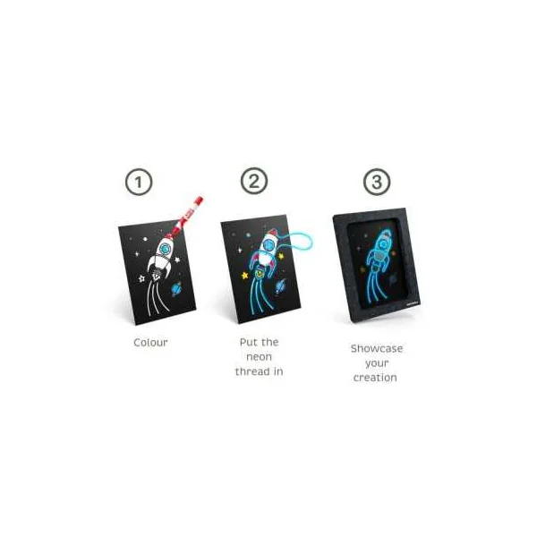 Grâce aux 9 planches pré-perforées et aux 3 fils néon de couleurs différentes, l’enfant peut composer des oeuvres uniques et lumineuses à exposer fièrement. Ce coffret créatif combine activité manuelle, imagination et décoration pour offrir une expérience ludique complète. L’enfant colorie le dessin en utilisant les 6 marqueurs de couleur inclus, ce qui lui permet de s’approprier son tableau et de laisser libre cours à sa créativité.