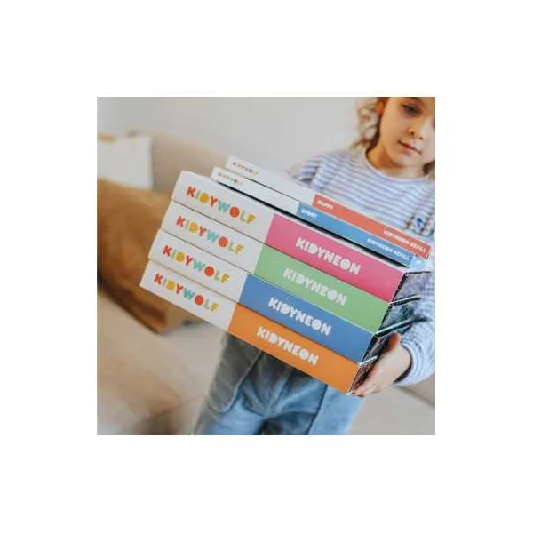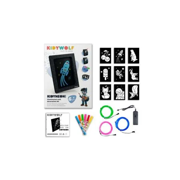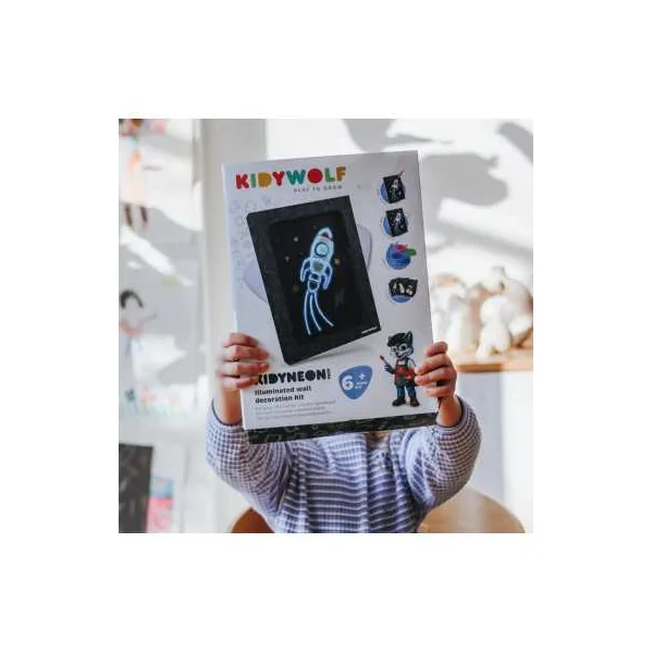 Découvrez le Kit complet Kidyneon de Kidywolf, un coffret de loisirs créatifs pour les enfants dès 6 ans, qui permet de créer un tableau décoratif lumineux.