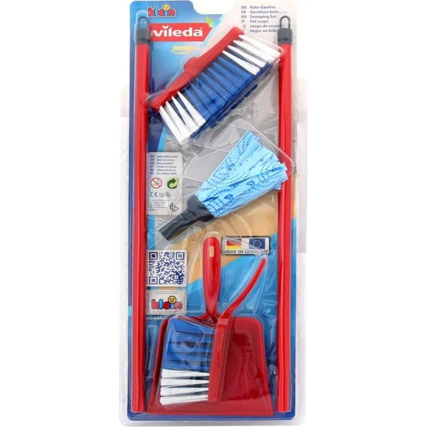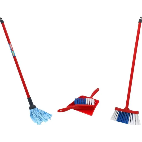 Le set contient une mop, un balai, une petite balayette et une pelle tous de la marque Vileda.