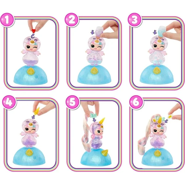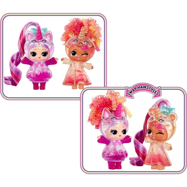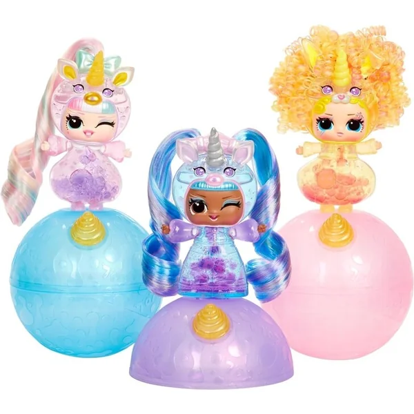 LOL Surprise! poupée avec un corps transparent et une tête en forme de licorne. Dans l’emballage, tu trouveras 2 flacons de liquide pour remplir le corps. Une fois rempli, des bulles colorées glisseront dans la poupée et celle-ci créera un effet de lampe à lave.