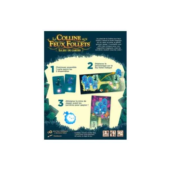 Dans ce jeu de cartes, vous incarnez des apprentis et suivez les feux follets pour rejoindre Jasper le Gnome qui souhaite vous offrir des cristaux magiques de sa mine. Mais les sorcières veulent les récupérer avant vous! Choisissez donc tous ensemble les meilleures cartes à jouer pour arriver avant elles et déjouer leur plan.