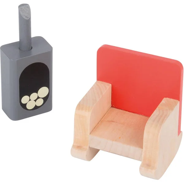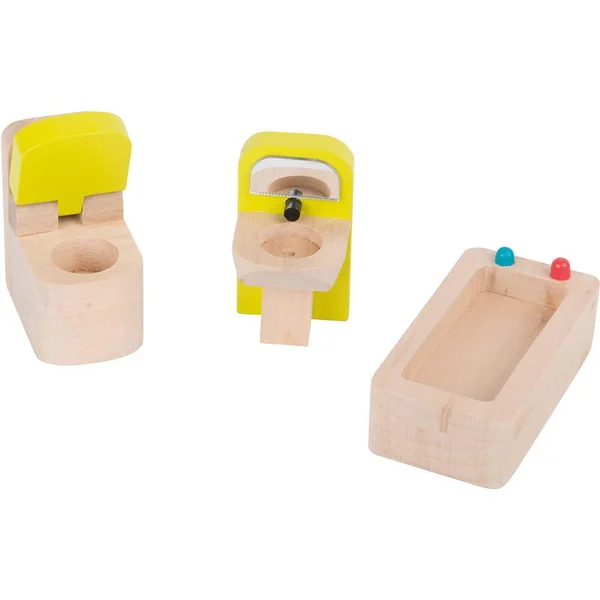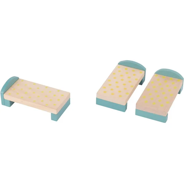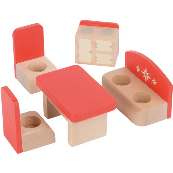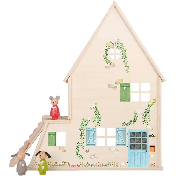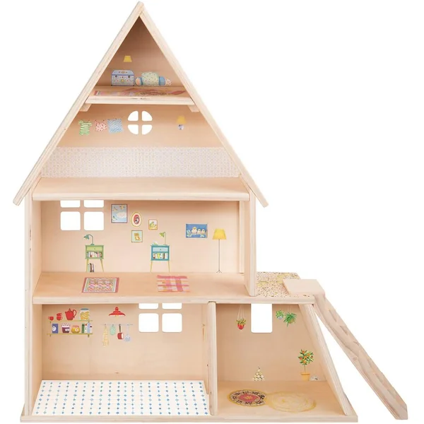 Pour jouer et se raconter des histoires, maison de poupée en bois sérigraphiée, à monter, ambiance maison de village comprenant une cuisine, une chambre dortoir, une salle de bain, un jardin d’hiver, un grenier pour se cacheret tout son mobilier.
