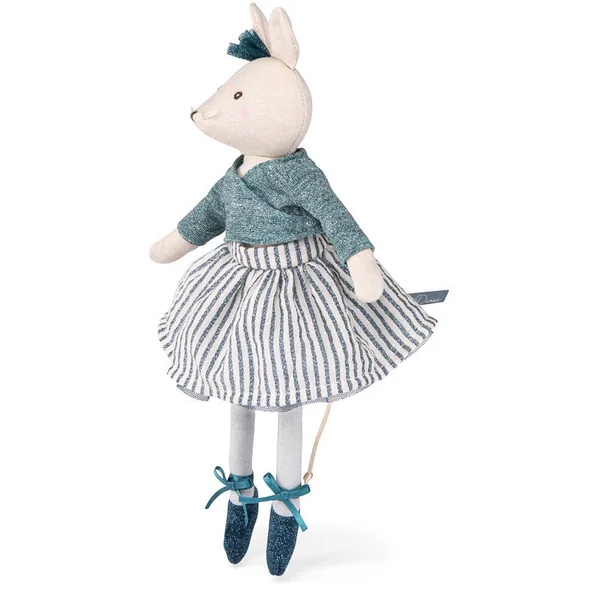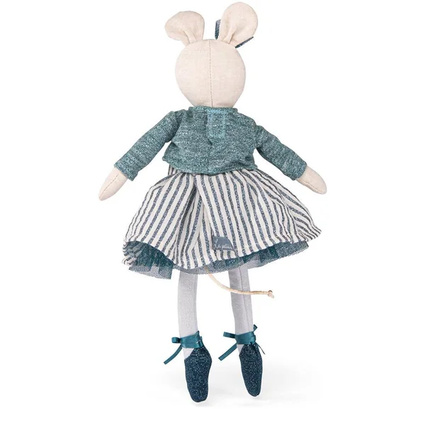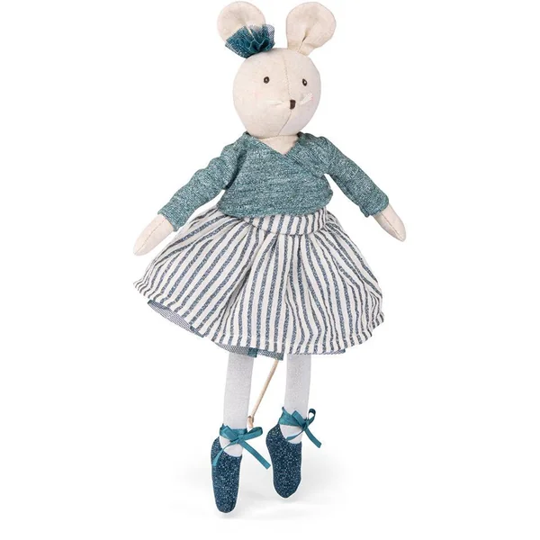 Petite souris Charlotte, en chambray au doux visage brodé et joues délicatement poudrées, tout de bleu vêtue, dispose de la panoplie complète de la danseuse. Amie idéale pour partager des instants féeriques, elle peut revêtirles tenues de la valise à tutus.