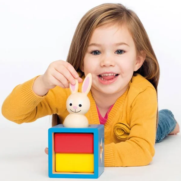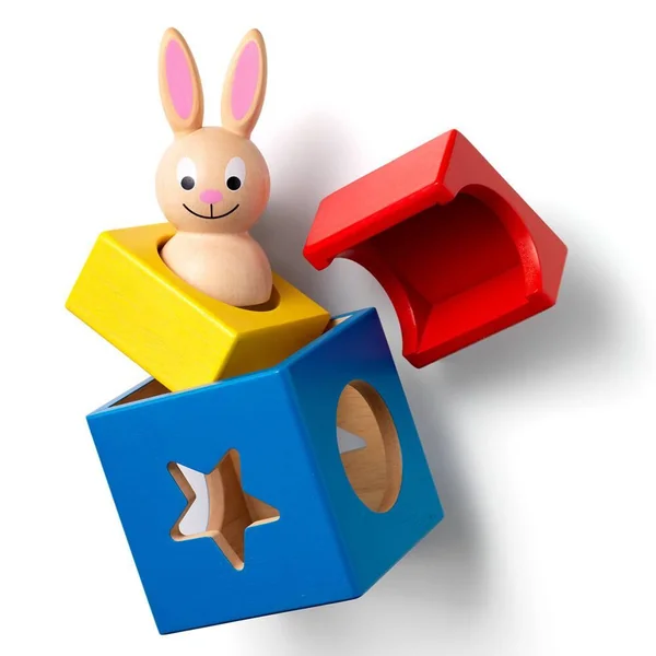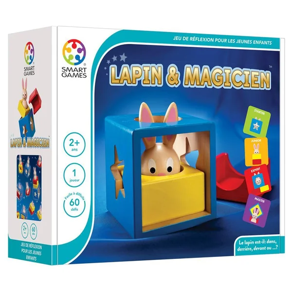 Où est le lapin ? Assis sur le bloc jaune, rouge ou bleu ? Regarde-t-il à travers le trou rond ou bien l’étoile ? Lapin & Magicien est un jeu destiné aux jeunes enfants afin de leur permettre de découvrir le monde fascinant de la 3D. Votre enfant pourra tout aussi bien résoudre les 60 défis proposés ou plus simplement jouer avec les différentes pièces de couleur et le lapin rigolo. Le jeu propose 60 défis de très facile à difficile. La boîte contient un bloc en bois de chaque couleur : rouge, jaune et bleu, des cartes recto/verso proposant 60 défis, les règles du jeu et lessolutions. jeu de reflexion pour un joueur. Comment jouer ? Choisissez un défi proposé sur l’une des cartes défi. Reproduisez l’illustration de la boîte magique et placez correctement le lapin. La boîte doit être stable. Lorsque vous avez reproduit à l’identique l’illustration du défi, c’est gagné!