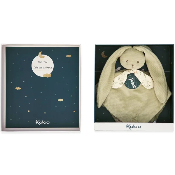 Ce joyeux doudou lapinoo couleur vert de 30 cm sera le parfait compagnon pour votre bébé. En bi-matière, côté velours côtelé et d’un tissu léger en viscose, il est parfaitement adapté au confort de bébé. Il a un style sobre et délicat. Son petit foulard lui apporte une touche raffinée. Le doudou lapinoo se démarque par ses longues oreilles qui sont trop craquantes. Grâce à elles, on peut l’accrocher partout pour le garder et ne jamais le perdre. Elles permettent à bébé en plus de l’envelopper dans le plus tendre des câlins, d’être facilement attrapables par de petites mains. Ce doudou gagnera les cœurs par sa douceur et sa tendresse. Le doudou se présente dans une jolie boîte personnalisable avec un message dans l’espace disponible sous le couvercle. Lavage en machine à 30°.