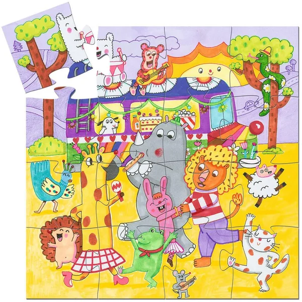 Le bus arc-en-ciel fait une pause dans la prairie pour un concert aux milles couleurs. Ce puzzle coloré de 16 pièces est présenté dans une jolie boîte silhouette en forme de bus fleuri.