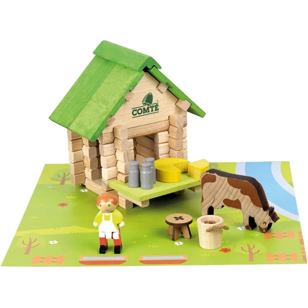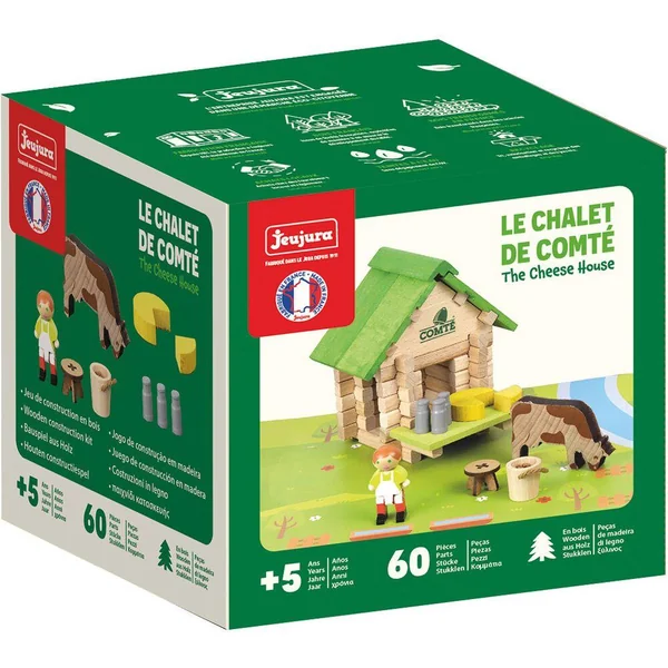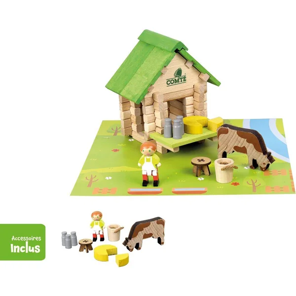 Le Chalet du Comté – 60 pièces : jeu de construction en bois naturel et teinté avec une notice de montage, un tapis de jeu et de nombreux accessoires. Coffret carton : 14 x 14 x 14 cm – A partir de 5 ans