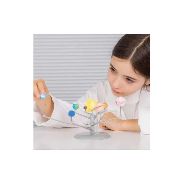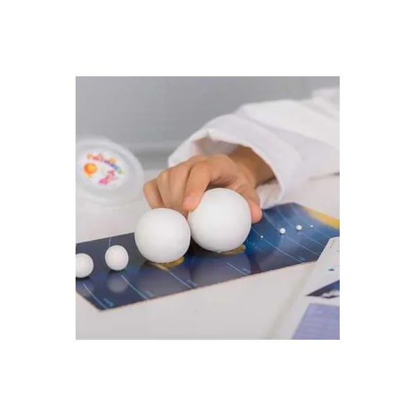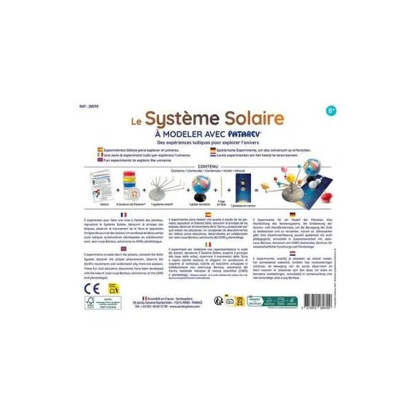 Grâce à la Patarev, une pâte à modeler créative, il sera possible de faire une mise à l’échelle des planètes, tout en découvrant leurs particularités, avant de construire un mini Système Solaire et d’observer le principe des éclipses. La notice montre également comment fabriquer une toupie qui, une fois lancée, aidera à comprendre et illustrer les mouvements de la terre, à l’origine des jours et des saisons.