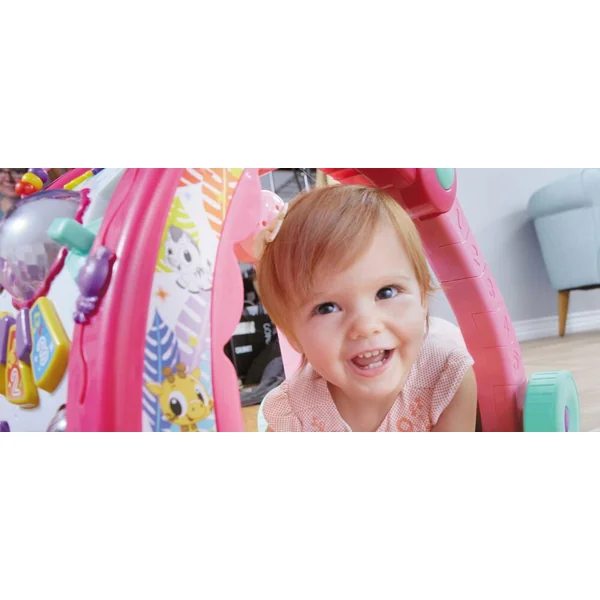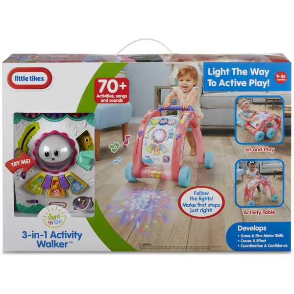 tiliser des lumières pour inspirer les bébés à bouger. Lorsque bébé commence à pousser le trotteur, des lumières amusantes s’activent et se projettent sur le sol devant le trotteur, inspirant bébé à continuer à bouger. Le contrôle de la vitesse réglable sur les roues protège les marcheurs débutants. Le déambulateur se convertit facilement en une table d’activités remplie de fonctionnalités amusantes et uniques. Les bébés peuvent s’asseoir et jouer puisque le trotteur se plie en deux, déplaçant le panneau d’activité près du sol. Avec plus de 70 activités, chansons et sons et 3 façons de jouer, votre bébé apprendra les formes, les couleurs, la musique et plus encore avec le trotteur d’activités 3 en 1 Learn & Play !