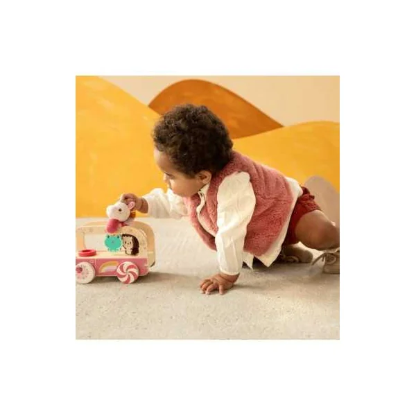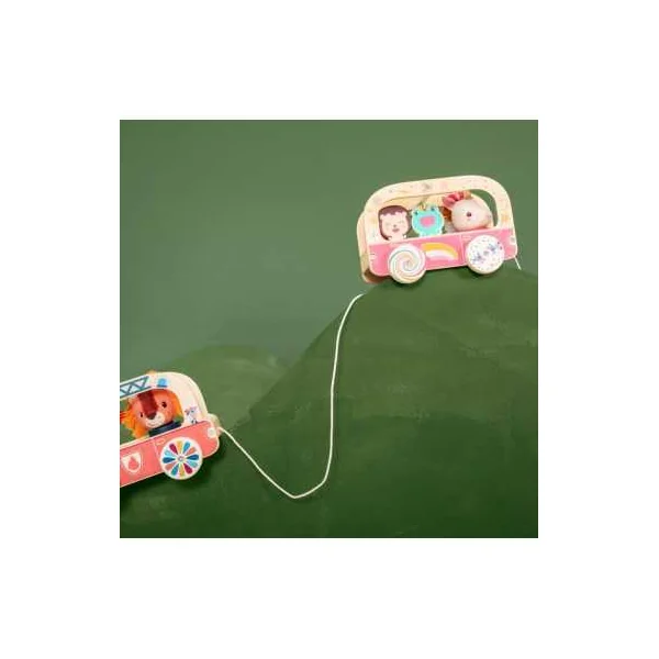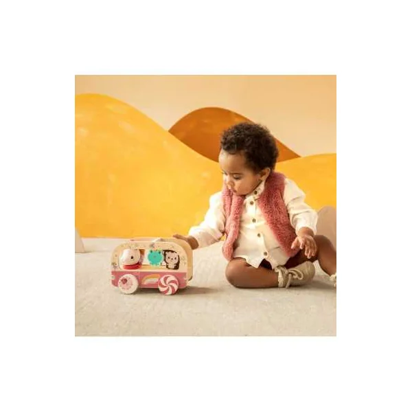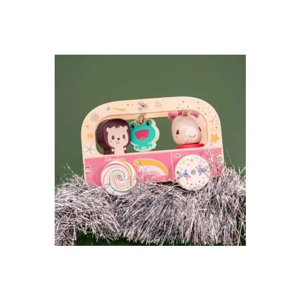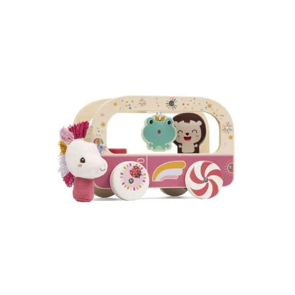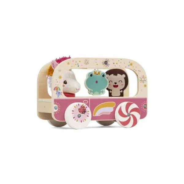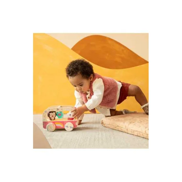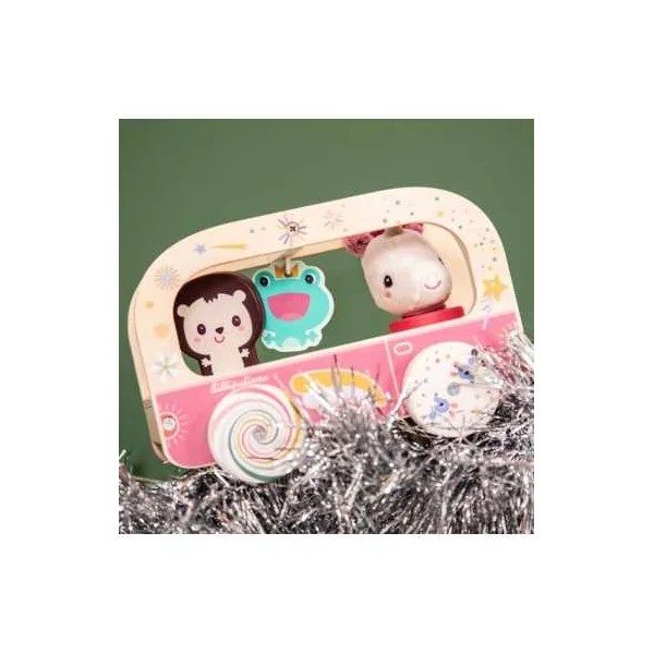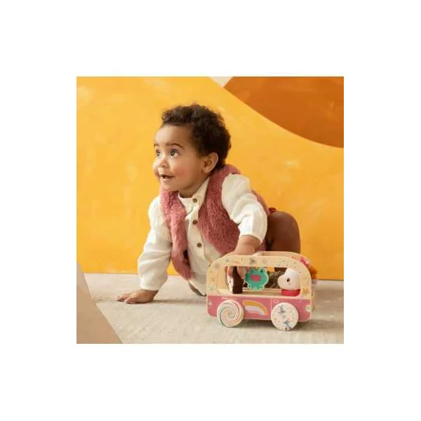 1, 2, 3… c’est parti! L’enfant pousse le bus et… magie! Les roues tournent et créent de drôles d’effets visuels. À l’intérieur, Léon le hérisson pivote, bouscule la grenouille qui se met à se balancer dans tous les sens. Et hop, Léna la licorne peut descendre pour explorer le monde. Quand l’enfant commence à marcher, une corde permet d’emmener tout ce petit monde en promenade.