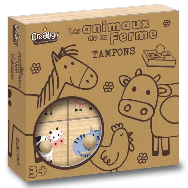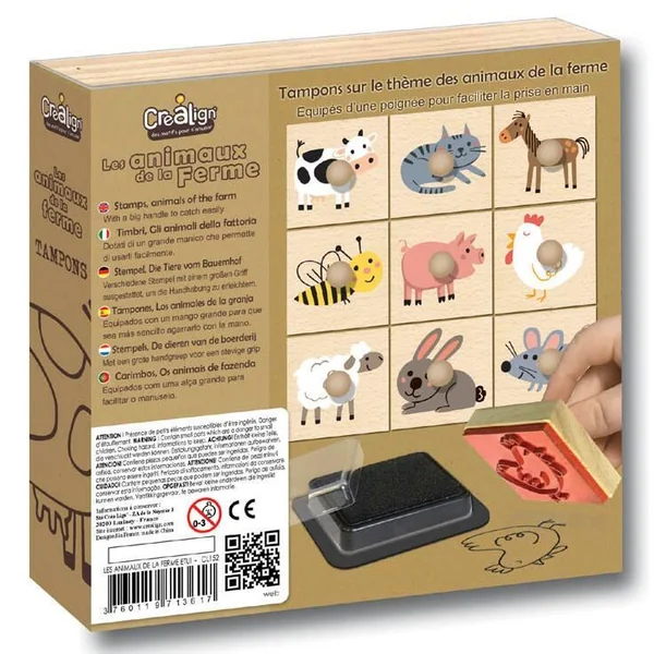 Un coffret bois pour tamponner les animaux de la ferme. Les tampons sérigraphiés sont équipés d’une poignée facilitant la prise en main. Une boite carrée en bois contenant 9 tampons en bois sérigraphiés équipés d’une poignée pour faciliter la prise en main. 1 encreur noir (surface d’encrage 50 x 50 mm). Dimension socle : 50 x 50 x 14 mm. Diamètre poignée : 16 mm. Hauteur poignée : 20 mm. Encre lavable à l’eau. Contient 9 tampons en bois et 1 encreur.