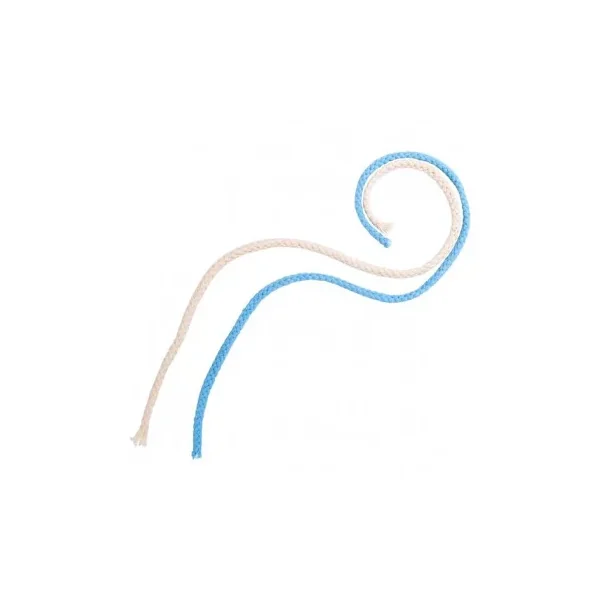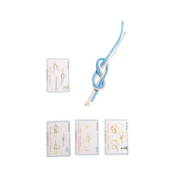 Deux cordes de couleur naturel et bleue, présentées dans une jolie boîte comprenant quatre cartes imprimées recto-verso pour apprendre à réaliser facilement différents nœuds grâce aux tutoriels illustrés : nœud en huit, nœud plat… et bien d’autres.