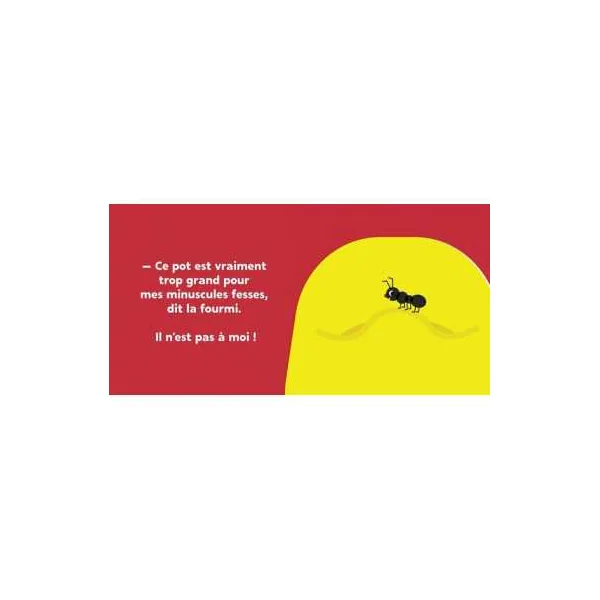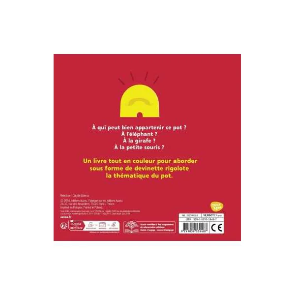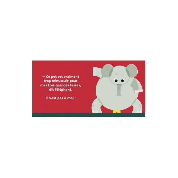 À qui est ce pot? Il est trop petit pour l’éléphant, trop grand pour la fourmi, et la girafe? Elle ne le voit même pas! À qui est ce pot? Ce texte balaye plusieurs animaux pour trouver la réponse. Il s’avère que le pot est bel et bien celui d’un enfant. Un outil pour aborder la question du pot et de la propreté.