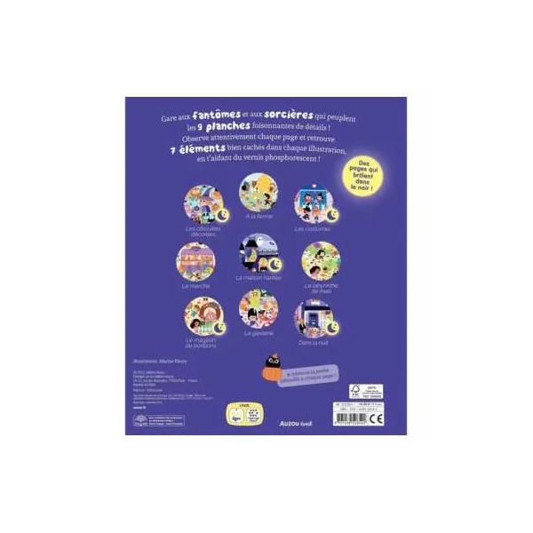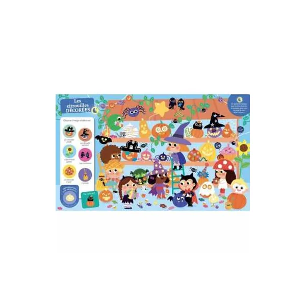 A travers 9 planches foisonnantes de détails, les petits partent à l’exploration d’endroits hantés et drôlement effrayants ! Ils observent attentivement et retrouvent 7 éléments (+ la mascotte) bien cachés sur chaque planche : de gentils fantômes, des drôles de vampires, des citrouilles vivantes ou encore des sorcières malicieuses…