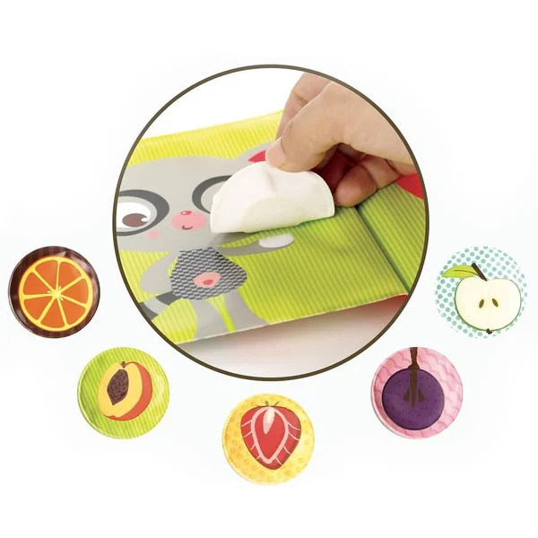 En y frottant son doigt, l’enfant découvrira un parfum qu’il devra associer au fruit illustré. Il pourra ensuite placer la pastille au bon endroit à l’aide du scratch.