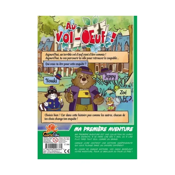 Découvrez le livre Ma première aventure Au vol-oeuf!, un livre jeu de Jean-Philippe Sahut, illustré par Elodie Bénard, édité par Gameflow. Un livre qui offre une première lecture ludique pour les enfants, avec une histoire qui change à chaque lecture.