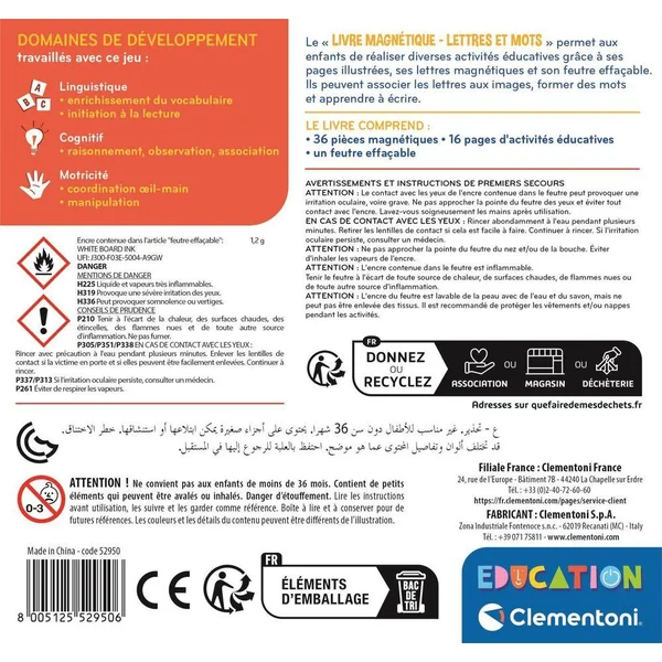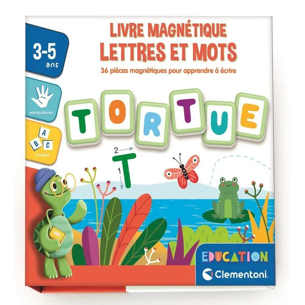 • Un livre magnétique simple et ludique de 16 pages, concu pour accompagner les enfants dans l’apprentissage des lettres et de leurs premiers mots. • Grâce à ses 36 pièces magnétiques, ses pages illustrées et son feutre effacable, l’enfant peut s’exercer à : -Associer les lettres aux images