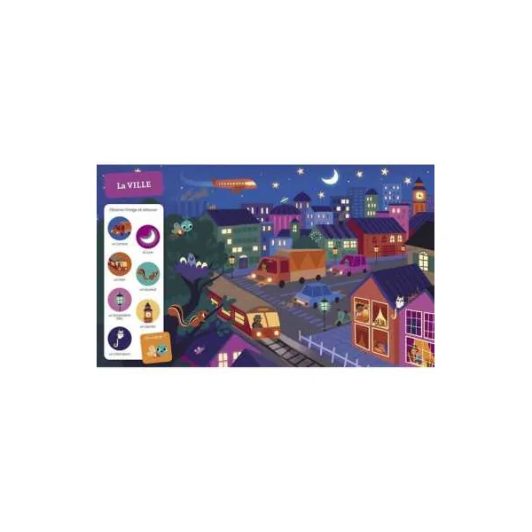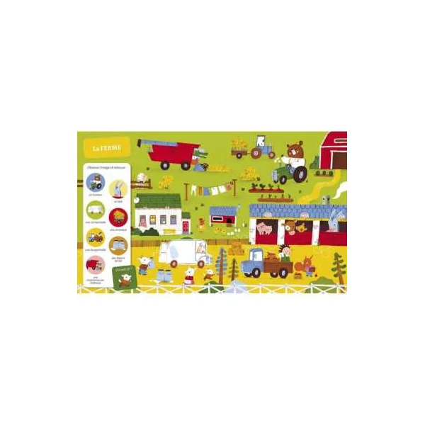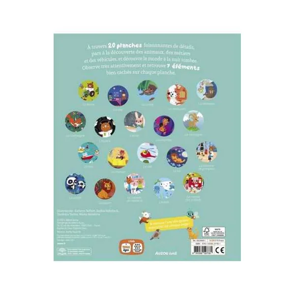 À travers 20 planches foisonnantes de détails, les enfants partent à la découverte de divers univers tels que la ferme, la ville, la rivière, la campagne, le chantier, le désert, l’océan, l’espace, l’école… Chaque double page propose de retrouver 7 éléments et une mascotte bien cachée.