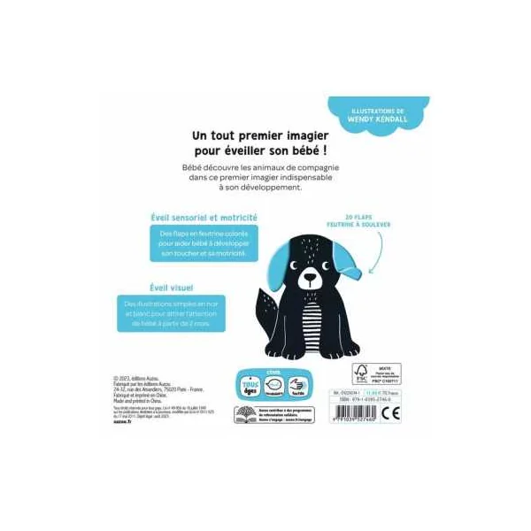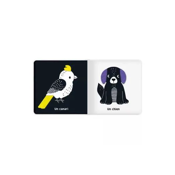 Bébé découvre l’univers des animaux de compagnie à travers un imagier en noir et blanc, indispensable à son développement. Des flaps en feutrine colorés aide bébé à développer sa motricité. Leurs couleurs contrastent avec les illustrations en noir et blanc, qui attirent ainsi l’attention du bébé dont la vision est en plein développement
