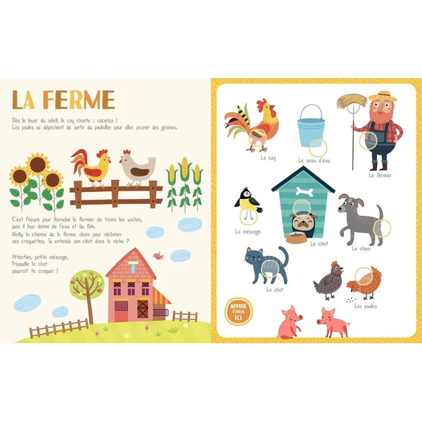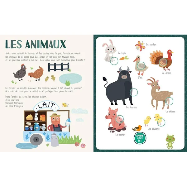 Bienvenue à la ferme ! Tous les matins, Barnabé le fermier va traire les vaches, puis il s’occupe des cochons, des chèvres et des moutons. Dans la basse-cour, les oies se chamaillent avec le dindon… Avec ce livre, les enfants vont partir à la découverte de la ferme, des animaux et des engins. Ils apprendront à reconnaître et à imiter leurs cris ou leurs bruits, grâce à 50 boutons sonores. Chaque double-page présente 5 à 8 sons. Les illustrations sont adorables et les sons de très bonne qualité, pour des heures d’éveil et d’amusement.