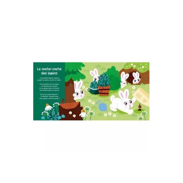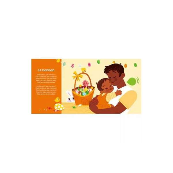 Un livre sonore pour s’initier au rythme et danser seul ou à plusieurs sur 6 comptines : Il pleut des œufs dans le jardin ; Le cache-cache des lapins ; As-tuvu?; Petit frère ; Vole, joli papillon et Le bonbon.