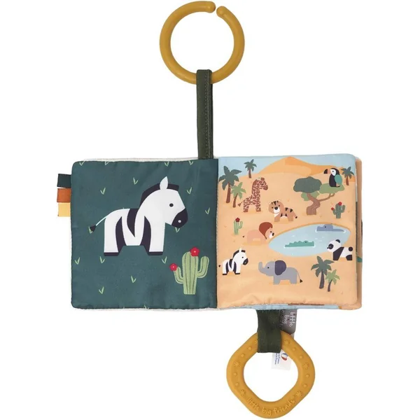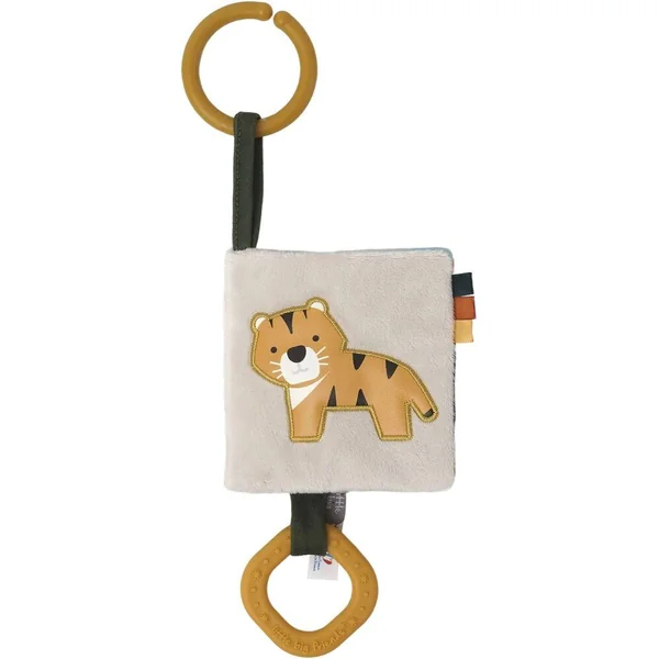 Le livre tissu bébé – Jungle est un mini livre d’éveil idéal pour stimuler les sens de bébé en déplacement ou à la maison. Facile à saisir et à manipuler, il éveille les tout-petits grâce à son mélange de textures douces : cuir végan, tissu imprimé bruissant, éléments en peluche et détails brodés. Avec des activités ludiques comme un anneau de dentition, un pouet sonore et des rubans colorés à attraper, il encourage la découverte tout en favorisant le développement de la motricité fine et de la coordination œil-main. Ses illustrations colorées sur le thème de la jungle captiveront bébé et le familiariseront avec les animaux. Grâce à sa boucle d’attache, ce livre tissus se fixe facilement à la poussette ou au cosy, pour l’accompagner partout, que ce soit lors de balades ou de moments de détente.