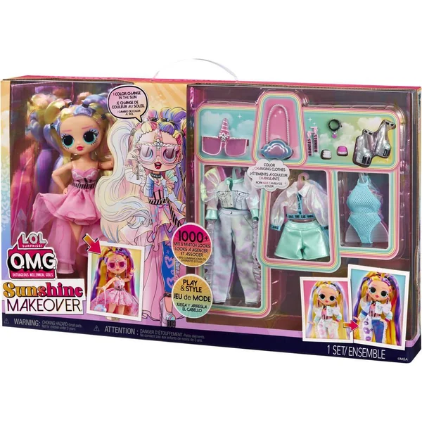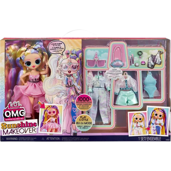 Prépare-toi à être ébloui par les changements de couleur de la poupée exclusive L.O.L. Surprise O.M.G Sunshine Makeover ! A la lumière du jour, leurs vêtements, les cheveux ou autres détails changent de couleur ! Contient plus de 1000 looks à mélanger et associer.