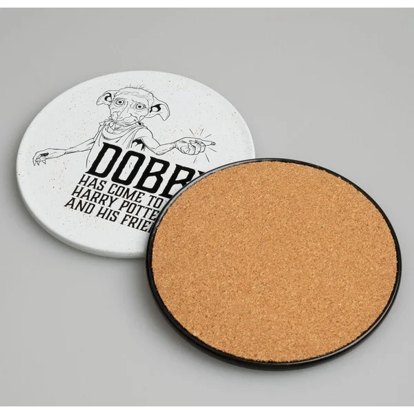 Lot de deux sous-verres avec base en liège et surface en étain avec motif imprimé. Dimensions : 9 x 9 cm.
