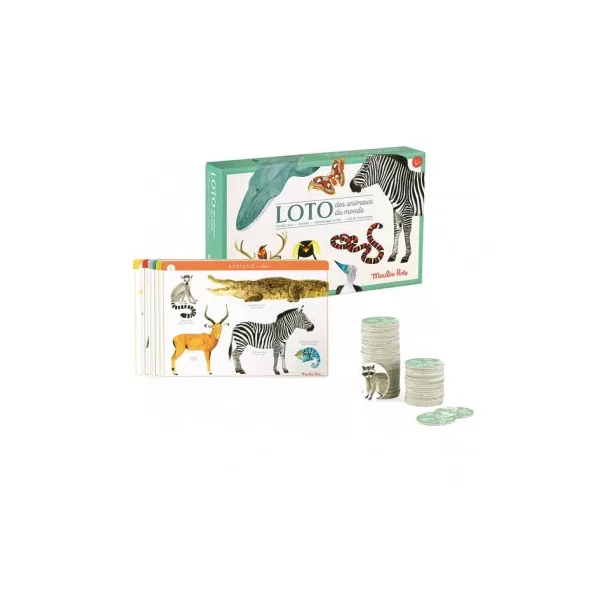 Découvrez le jeu Loto des animaux de la collection Tout autour du monde de Moulin Roty, un jeu éducatif pour découvrir les animaux à partir de 4 ans. Un coffret fabriqué en France.