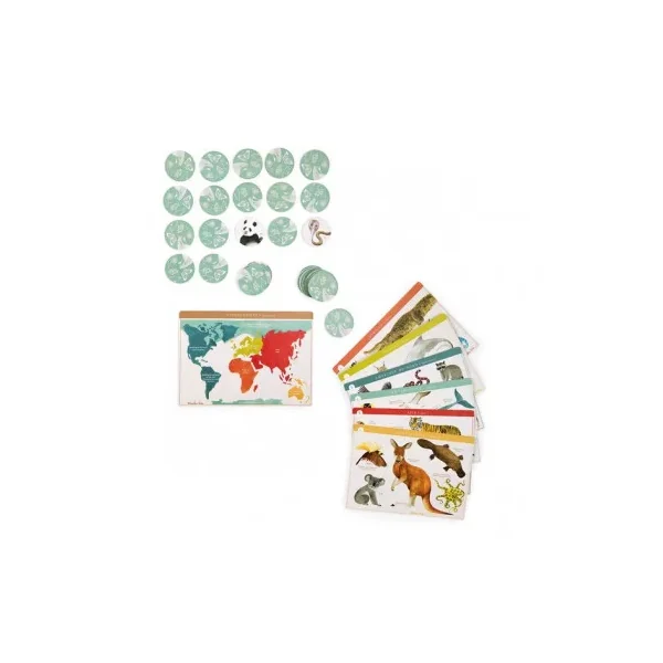 Joliment illustré, ce loto contient 6 planches continents recto-verso et 60 jetons. Le premier joueur à avoir complété entièrement sa ou ses planches remporte la partie.