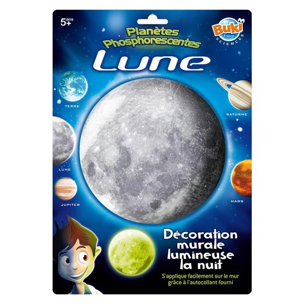 Planète phosphorescente à coller sur le mur ou le plafond d’une chambre. 1 minute d’exposition à la lumière équivaut à 1 heure de diffusion ! 5 modèles disponibles : Terre – Lune – Saturne – Jupiter – Mars. Le ruban adhésif double face est fourni.