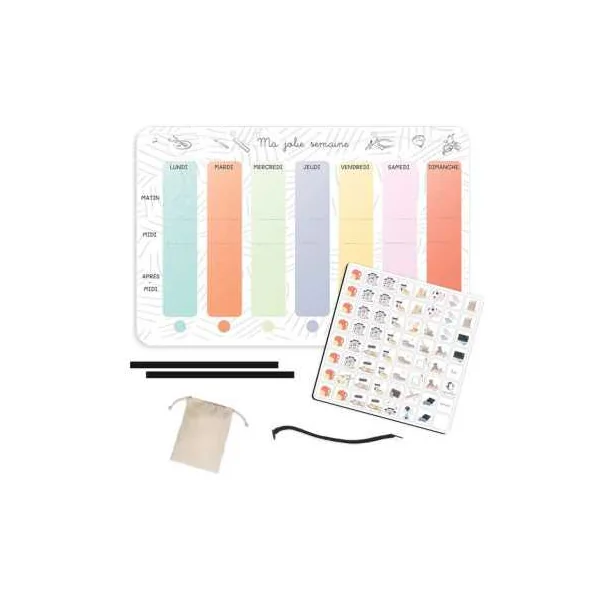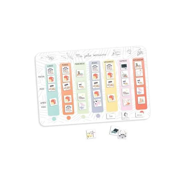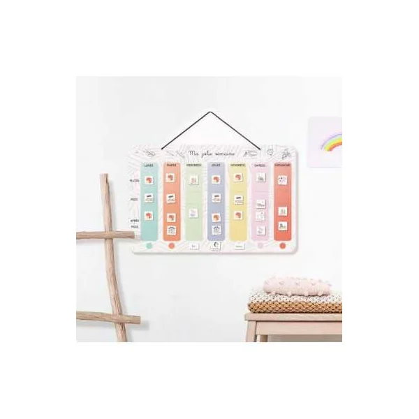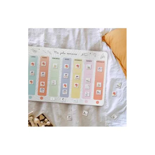 Découvrez le tableau Ma jolie semaine de L’atelier gigogne, un outil éducatif et magnétique fabriqué en France à partir de 3 ans, un joli semainier pour accompagner votre enfant dans l’apprentissage de la notion du temps.