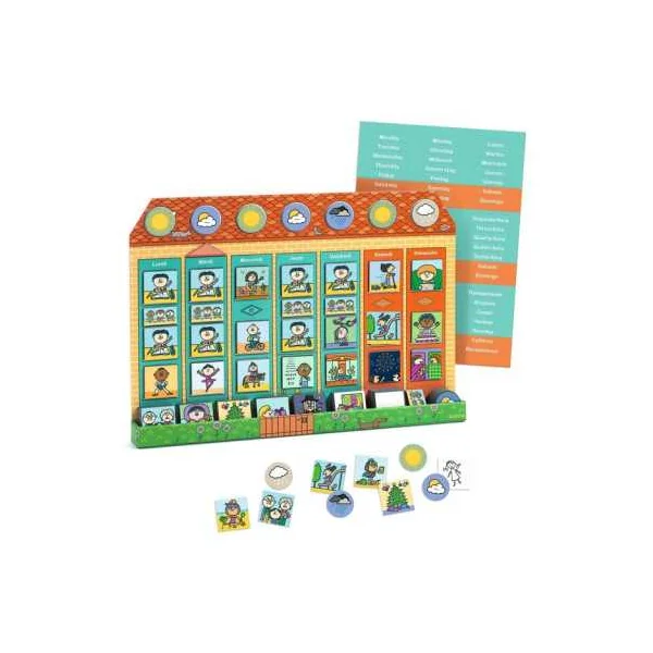 Ce jeu éducatif offre une approche amusante pour apprendre les notions de passé, présent et futur dans le cadre de la vie quotidienne de l’enfant. Il se compose d’un tableau magnétique en forme de maison sur lequel on retrouve les 7 jours de la semaine, ainsi que de 86 magnets représentants diverses scènes du quotidien (école, cantine…), activités sportives ou artistiques, événements réguliers ou exceptionnels (anniversaire…), ainsi que la météo, offrant ainsi une infinité de possibilités pour organiser la semaine. De plus, les aimants vierges permettent à l’enfant de personnaliser son semainier en dessinant ses propres illustrations.