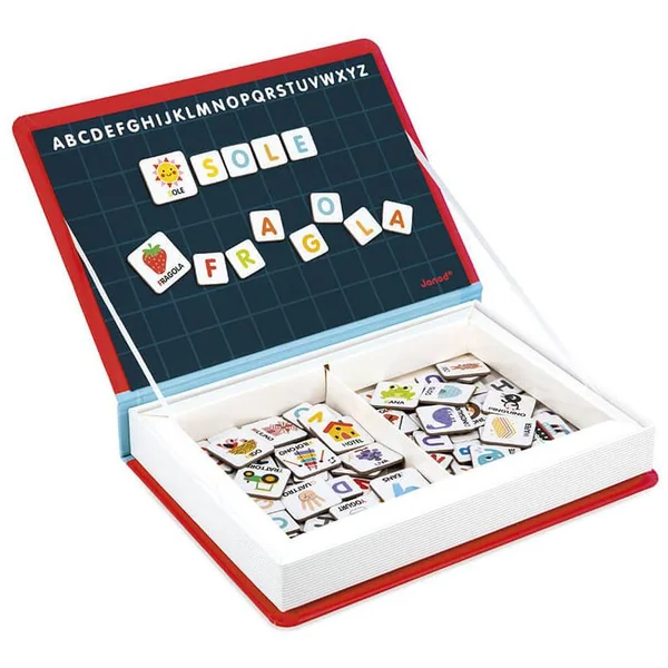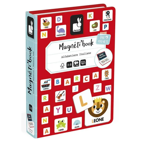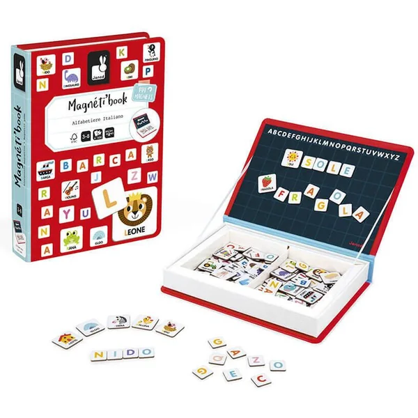 Apprenez l’alphabet italien en vous amusant grâce au Magnéti’book ! Ce joli jouet coloré se compose d’un tableau magnétique, de 118 magnets alphabet et 26 magnets illustrés. Choisissez une image et apprenez à composer le mot qui lui correspond. Ludique et adapté aux petits, le Magnéti’book permettra à votre enfant de développer l’apprentissage de l’écriture tout en s’amusant. Jouet magnétique en carton FSC™ pour les enfants –