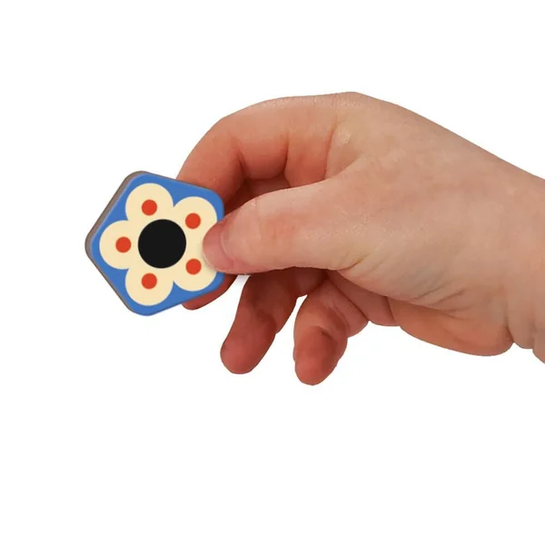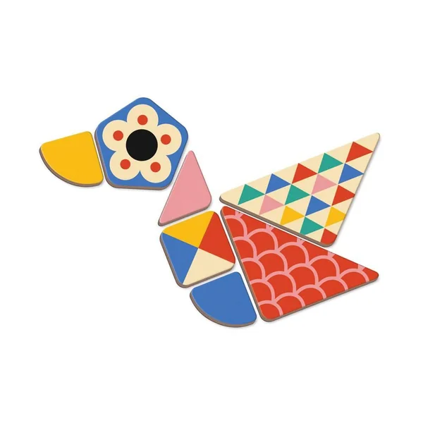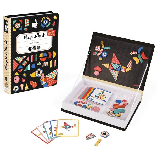 Jeu éducatif magnétique en carton sur le thème du tangram. Composé de 43 magnets et de 30 cartes. Une fois le livre ouvert, le but du jeu est de recomposer sur la scène le tangram indiqué sur la carte à l’aide des magnets.