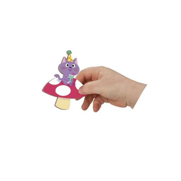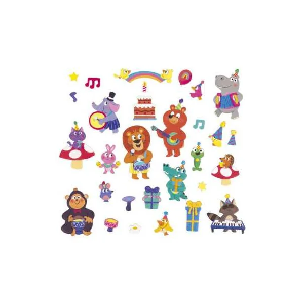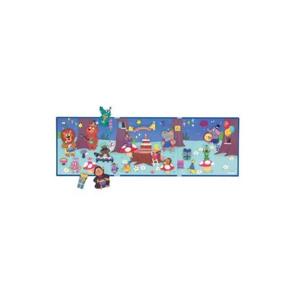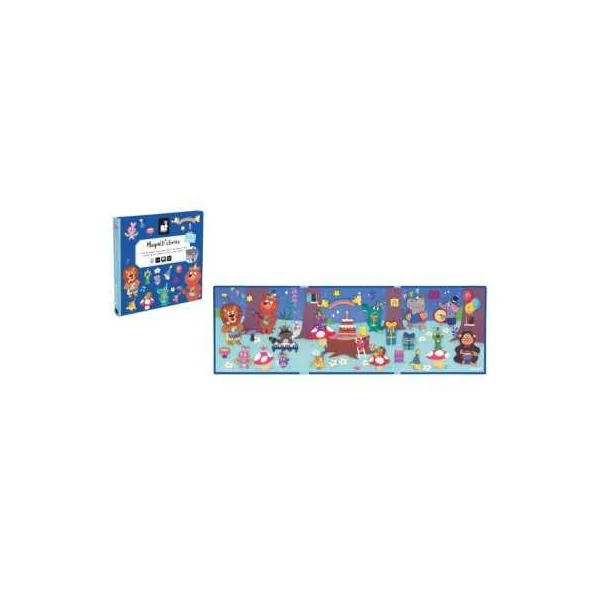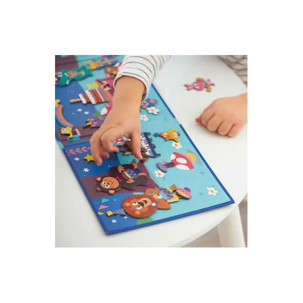En ouvrant ce livre magnétique, votre enfant découvrira un joli décor festif, sur lequel il placera les pièces aimantées pour reconstituer des scènes avec des animaux rigolos faisant de la musique, des cadeaux, un gâteau d’anniversaire, un arc-en-ciel, des étoiles, des notes de musique…