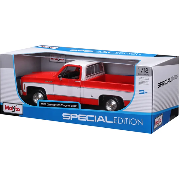 Édition Spéciale 1:18 – 1974 Chevrolet® C10 Cheyenne Super, rouge-blanc, modèle exclusif de la collection de collection avec un accent sur le détail et un design authentique.