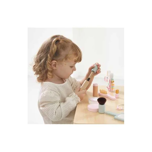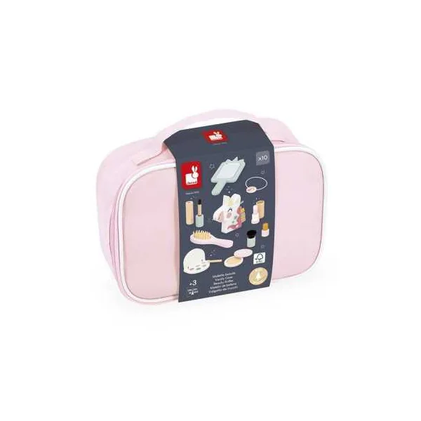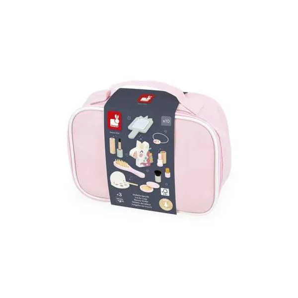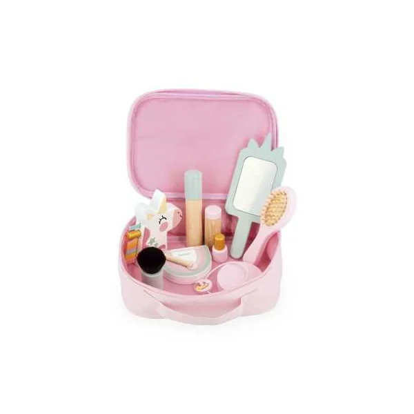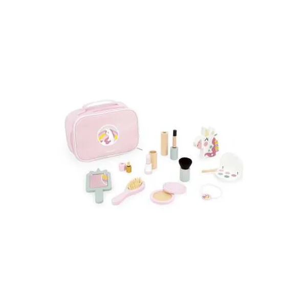 Ce coffret complet comprend 10 jouets en bois, parfaits pour imiter les gestes des grands avec créativité et imagination. Votre enfant y trouvera un pinceau kabuki, un blush, une brosse à cheveux, une palette de fards à paupières avec son applicateur, un mascara, un rouge à lèvres, un vernis, un parfum en forme de licorne, un miroir et un élastique.