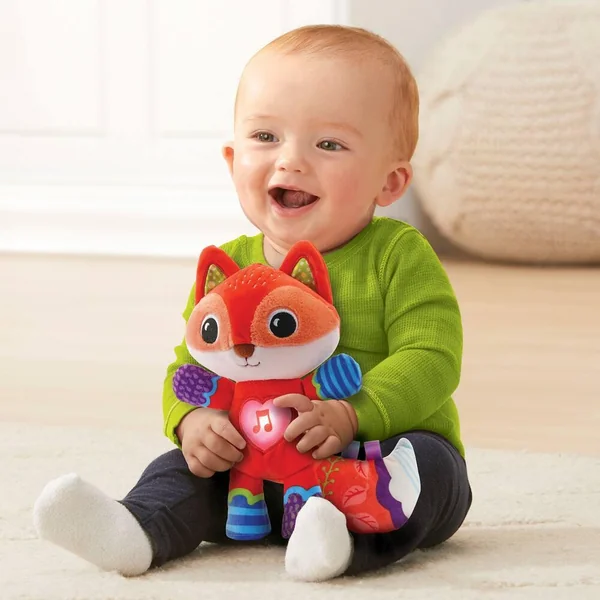 Malo, mon renardeau dodo. De 0 à 36 mois. Plusieurs matières sur les différentes parties du corps pour stimuler le sens du toucher : papier bruissant, tissu satiné, velours, peluche. Un bouton lumineux sur le ventre (avec variations de couleurs) pour déclencher des musiques douces et des chansons. 2 chansons et 30 mélodies. Module électronique détachable pour lavage à la main. Arrêt automatique. Pile de démonstration fournie