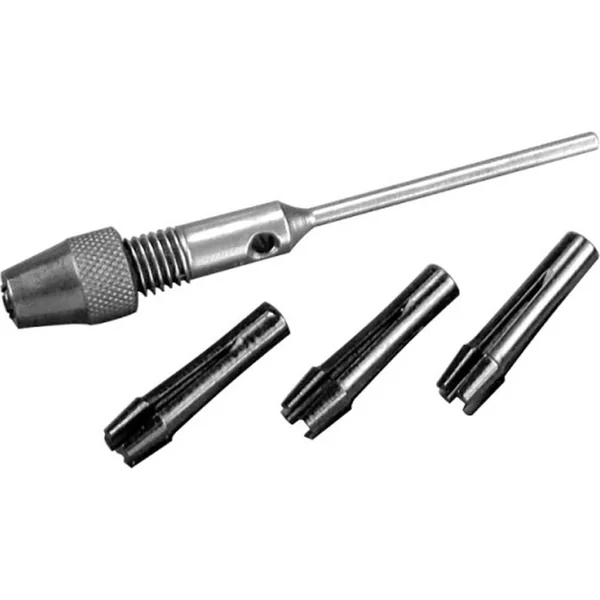 Le mandrin Modelcraft pour forets avec 4 pinces de diamètres 1mm ; 1,96mm ; 2,6mm et 3,2mm. Longueur totale de 63mm, poids de 13g, à utiliser avec des forets miniatures.